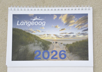 des Tourismus-Service ist der ansprechende Tischkalender für das Jahr 2026. Zusammengestellt von TSL-Mitarbeiterin Susanne Wittenberg, machen zwölf schmucke Monatsblätter plus Titelbild den Fotokalender zum idealen Begleiter im Jahreslauf – zu Hause wie im Büro. Im praktischen DIN-A5-Format kostet er 11,90 Euro. Erhältlich ist er, wie auch viele weitere Artikel, in der Tourist-Info im Haus der Insel sowie auf www.langeoog.de im Online-Shop.