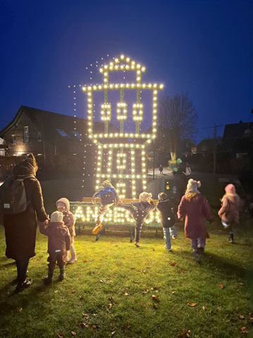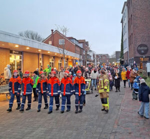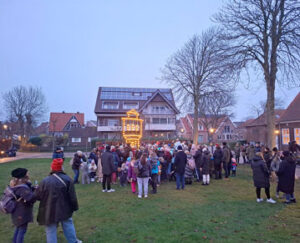 Die gelungene Aktion der TSV-Kultursparte, die sich seit 2024 um die Langeooger Adventsbeleuchtung kümmert, begann mit einem Laternenumzug. Er führte von der Lale-Andersen-Statue quer durch den Ort zum Festplatz und wurde von zwei Fahrzeugen der Langeooger Jugendfeuerwehr eskortiert. Mittendrin lief das „Team Dünensingen“ um Herbert Burmester und Eva Funke: Immer wieder hielt die bunte Lampion-Parade an, um fröhliche Laternenlieder zu singen.